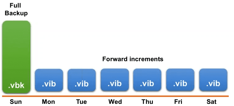 Veeam utilise une approche de sauvegarde incrémentielle pour économiser de l’espace de stockage. Il génère trois types de fichiers afin de stocker les données sauvegardées :
